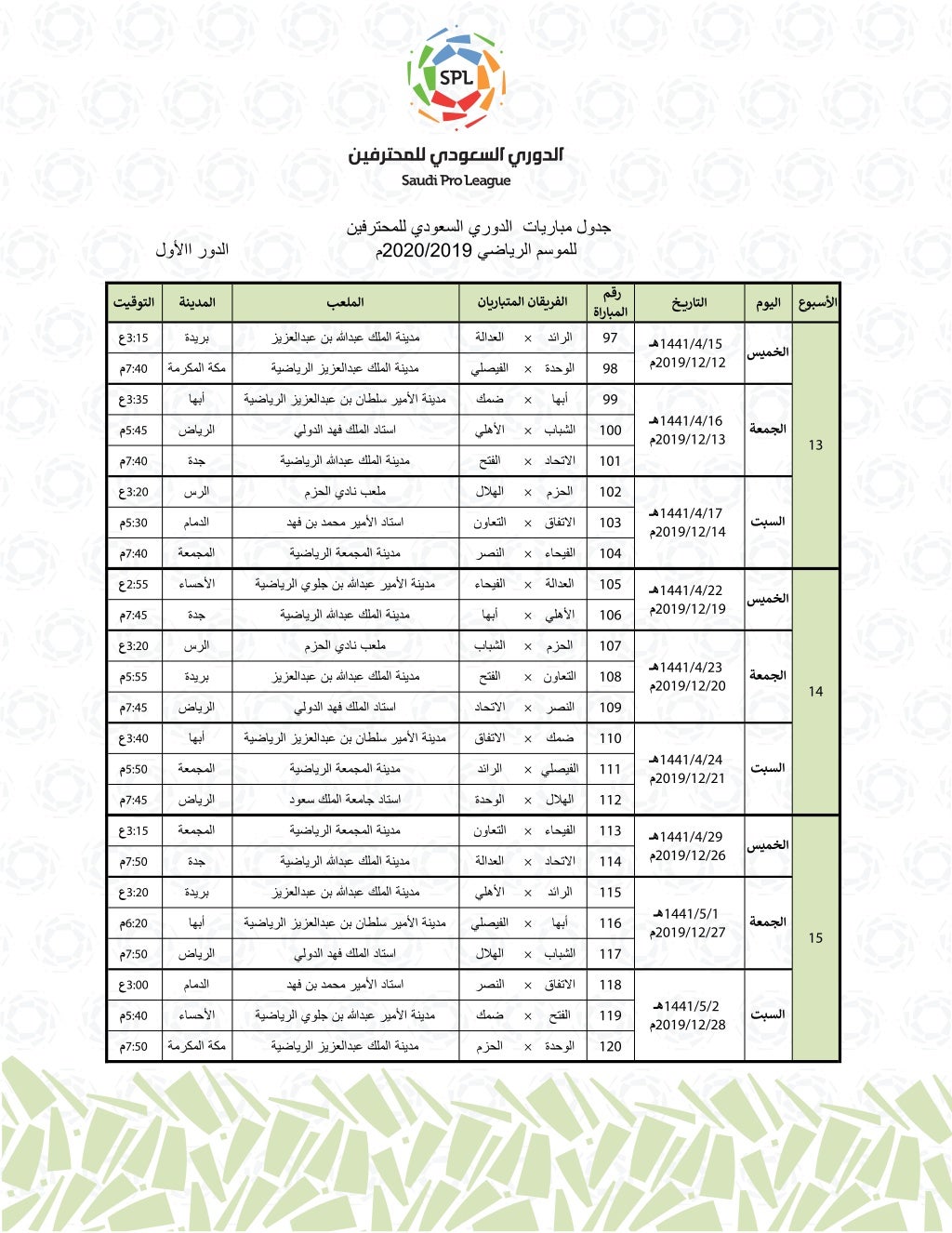 جدول مواعيد مباريات الدوري السعودي للمحترفين الموسم الجديد 2019 2020 الدور الأول